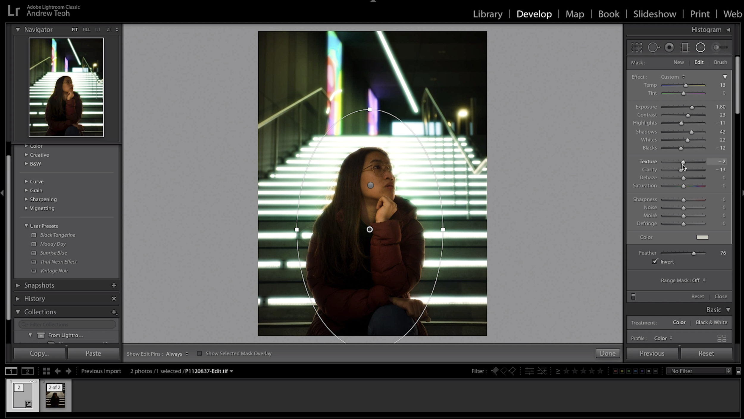 Step 9: This will be a slightly long step. Once you’re back into Lightroom, go and select the radial tool. Create a circle around the areas that you want to change the lighting colours.